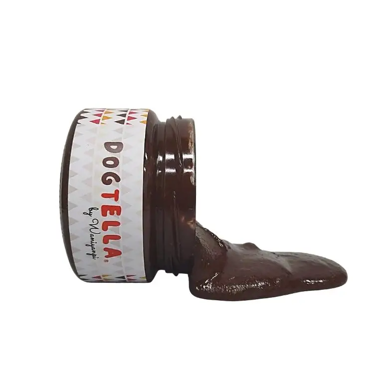 Dogtella est une pâte à tartiner pour chien gourmande et saine qui ne contient pas de chocolat, mais seulement de la caroube biologique, du beurre de cacahuète maison et de l’huile d’olive extra vierge.