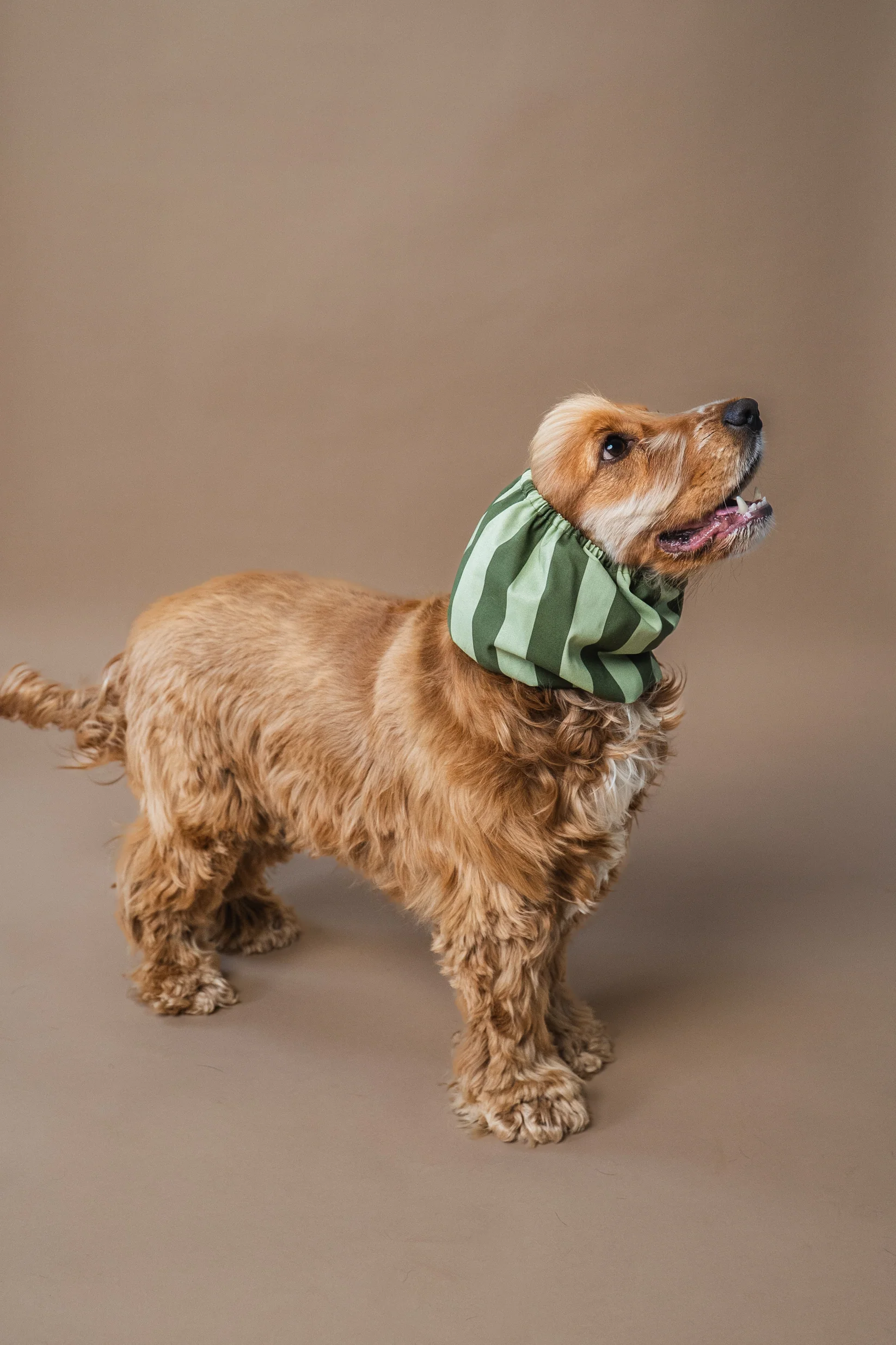 Un snood rayé vert pour protéger le cou et les oreilles de ton chien contre le vent, la poussière et les épillets.